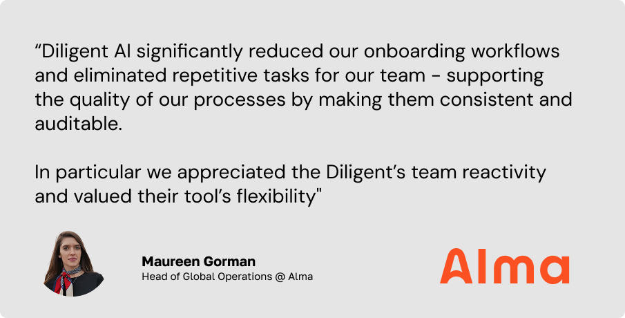 With Diligent supporting its merchant onboarding workflows, Alma has unlocked the next level of scale with confidence.